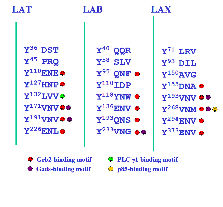 Activation via the antigen receptor (T cell receptor and B cell receptor) triggers a cascade of intracellular biochemical events eventually leading to lymphocyte proliferation, cytokine production, and effector functions. The primary focus of our laboratory is to understand the function of membrane-associated adaptor proteins in lymphocyte activation and development. We are working on three different adaptor proteins: LAT (Linker for Activation of T-cells), LAX (Linker for Activation of X cells), and LAB (Linker for Activation of B cells). These three proteins share a similar domain structure: a short extracellular domain, a transmembrane domain, and a cytoplasmic domain with multiple Grb2-binding motifs. LAT is expressed in T cells, mast cells, NK cells, and platelets. Upon T cell activation, LAT is tyrosine phosphorylated and associates with Grb2, Gads, and PLC-γ1. LAT-deficient Jurkat cells are defective in TCR-mediated Ras-MAPK activation and Ca2+ flux. LAT knockout mice have a severe block in T-cell development. Thus, LAT is essential for T cell activation and development. Recently we mapped tyrosine phosphorylation sites in LAT and demonstrated that LAT interaction with Grb2, Gads, and PLC-γ1requires multiple tyrosines. We continue to dissect the function of these tyosine residues in T cell activation by using mice expressing different LAT mutants. We are also investigating the role of LAT localization to lipid rafts during T cell activation and immune responses. LAX is expressed in T cells, B cells, and mast cells. It is phosphorylated upon BCR, TCR, or Fc receptor cross-linking. LAX interacts with Grb2, Gads, and p85. LAX functions differently from LAT because it fails to rescue defective signaling in LAT-deficient cells. Moreover, overexpression of LAX in Jurkat cells inhibits TCR-mediated p38 activation, suggesting that LAX might be a negative regulator. To examine the function of LAX in vivo, we have generated LAX-deficient mice. We are analyzing these mice to determine the effect of LAX-deficiency on lymphocyte development and function. LAB is expressed in B cells, mast cells, NK cells, and monocytes. Like LAT, it is localized to lipid rafts. Upon BCR or Fc receptor stimulation, LAB is phosphorylated and interacts with Grb2, however not PLC-g1/2. Functionally, LAB can partially rescue defective signaling in LAT-deficient Jurkat cells and thymocyte development in LAT-deficient mice. Currently we are comparing the functional difference between LAT and LAB using transgenic mice expressing LAB in T cells. We are also studying LAB function in vivo using mice deficient in LAB. In addition to these three adaptor proteins, we are trying to identify novel molecules involved in positive and negative regulation of antigen receptor signaling pathways by utilizing biochemical (proteomics), genomic (database searching), genetic (mutagenesis), and functional (expression cloning) approaches. Our long-term goal is to fully understand the antigen receptor signaling pathway. |