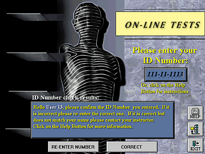 On entering the On-line Tests section, the student must enter their student I.D. Number which is matched against a database setup and maintained by the instructor. Each student's final exam scores are recorded to database files for each body region that are only accessible by the instructor. Students may take two practice tests in each region that are not scored and may take the tests and final exams at any time.