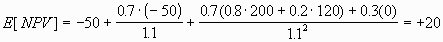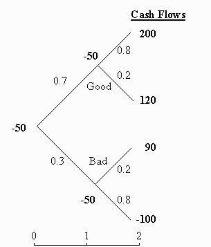 Suppose a clothing company is considering introducing a new line of fashion. The project has a two year life. An initial investment of $50 (cash flows are in thousands) is required to fund a year-long development phase. At the end of a year, a further $50 is required for production and cash inflows from sales (net of selling expenses) will occur at the end of the second year. There is some uncertainty about the amount of the cash inflows since it is unclear whether the market will embrace the new line. The firm currently believes that there is a 70% chance that the new line will be a winner. They also believe that the direction of fashions will become more apparent over the next year. In particular, there is an 80% chance that the direction over the next year will continue over the subsequent year. This uncertainty, and the associated cash flows, are represented in Figure 1. Suppose also that the required return on projects of this type is 10%. Standard capital budgeting techniques involve computing the expected net present value (NPV) as: