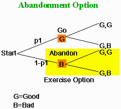 These strategic options, which are known as real options, are typically ignored in standard discounted cash flow (DCF) analysis where a single expected present value is computed. These real options, however, can significantly increase the value of a project by eliminating unfavorable outcomes. Consider the following stylized example to illustrate the value of an option to abandon a project during its life.
