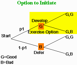 The option to choose when to start a project is an initiation or deferment option. For example, the purchaser of an off-shore lease can choose when, if at all, to develop property. Initiation options are particularly valuable in natural resource exploration where a firm can delay mining a deposit until market conditions are favorable. If natural resource companies were committed to producing all resources discovered, they would never explore in areas where the estimated extraction cost exceeded the expected future price at which the resource could be sold.