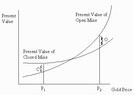 Now suppose the mine is shut. As the gold price rises, approaching P2, the mine is worth more open than closed because the revenues from the sale of gold are outweigh the costs of operating the mine. However, it is still optimal to keep the mine shut because the present value of the net operating revenues do not exceed the opening cost O. That is, we have an option to pay O to receive a net revenue stream that has a present value that is less than O. Clearly, we would choose to let that option lapse. When the gold price rises above P2, the present value of these net revenues exceeds O and the option should be exercised and mine restarted.