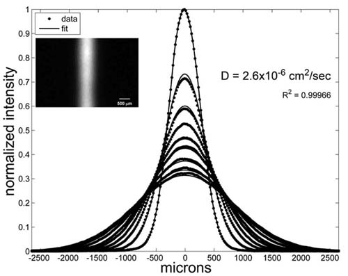 An ultraviolet light source uncages a defined region of fluorophore-labeled gel (the delivery vehicle). The resulting fluorescence is measured over time and space with a microarray scanner. The diffusion coefficient is computed by analyzing the temporal and spatial distribution of the photoactivated fluorophore compared to its original uncaged region.